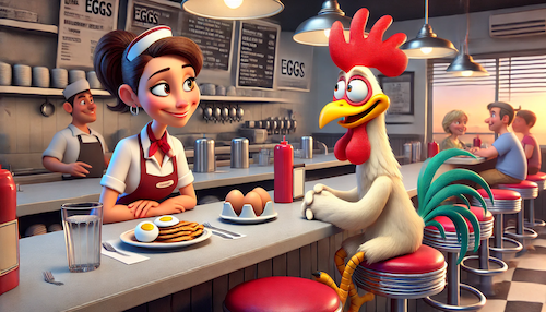 The rooster replied, “I’ll have the eggs, but make sure they’re not scrambled! I get confused!”